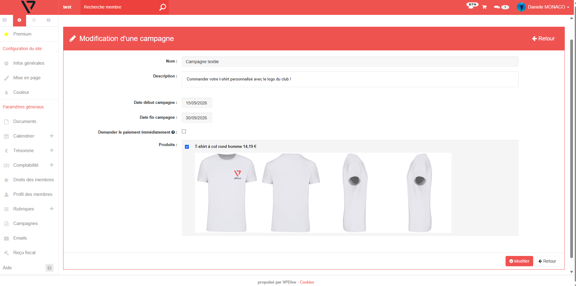 Rendez-vous sur votre espace VPDive et cliquez sur l’icône de la roue crantée, puis sur Print > Produit. Avant de commencer, vous pouvez consulter le catalogue des vêtements disponibles. Même si toutes les références ne sont pas encore en ligne, elles seront ajoutées progressivement selon vos demandes.